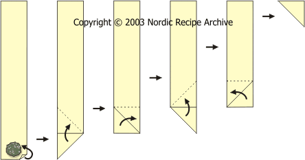 with the damp towel. Fold one corner of the strip diagonally over the filling so that the short edge meets the long edge (see the picture below). Continue folding from side to side until you reach the end of the strip and have